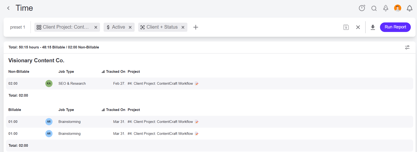 You can choose from a range of filters to customize your report, save filters as presets for future use, and group your results by two-level columns to get a cleaner overview. For example, you can group the results by client and by project or by client and by the person who tracked time and record status.