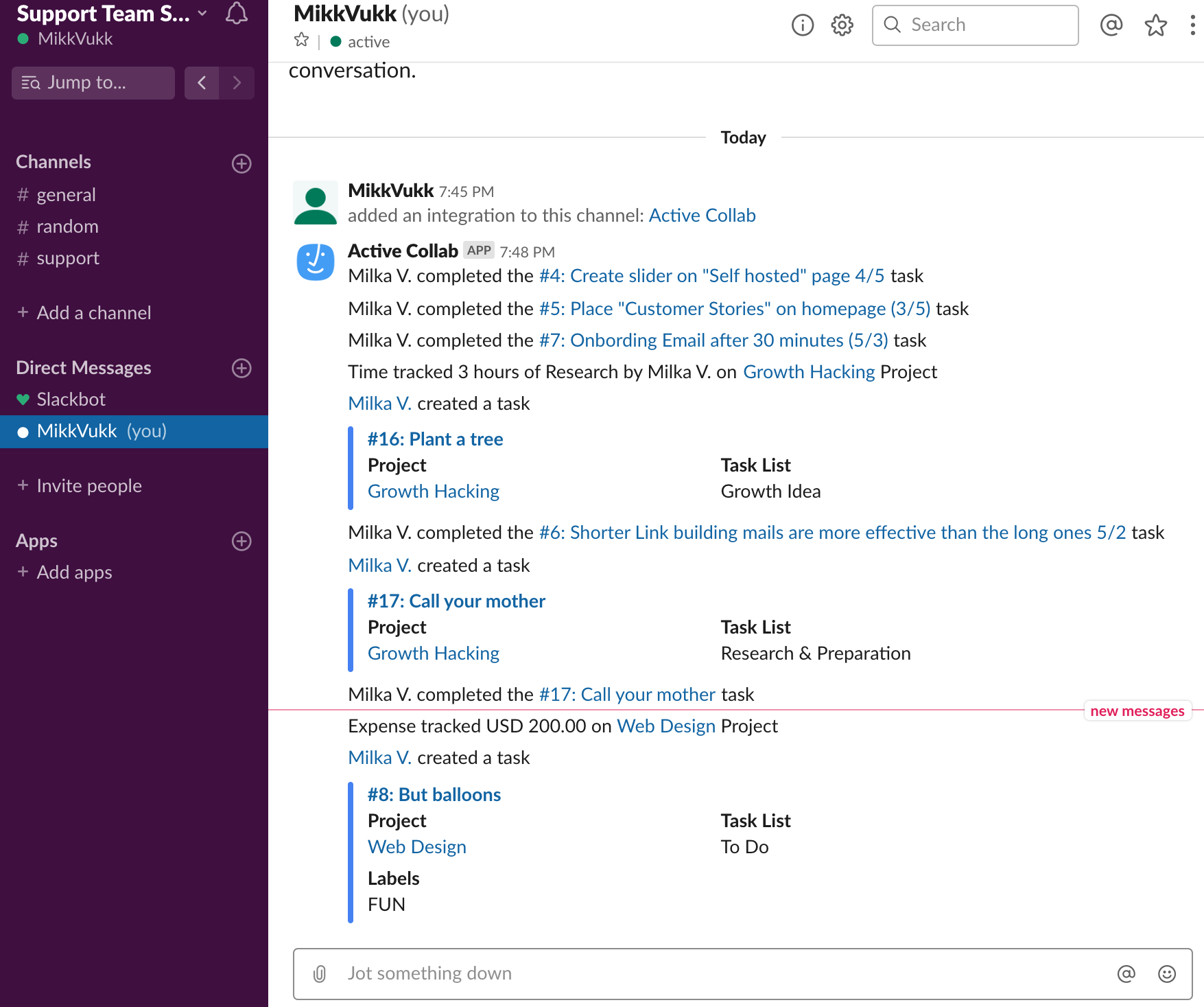 ActiveCollab can post updates from your projects to a Slack channel so you can receive notifications whenever:
