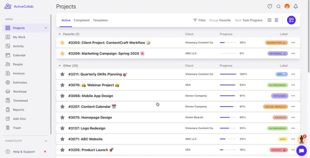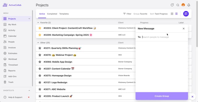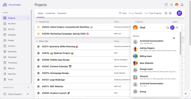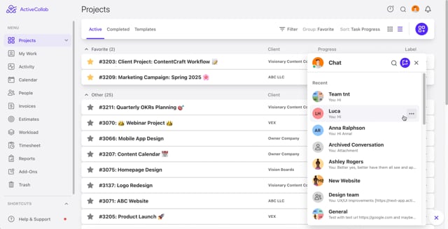 In-App chat in ActiveCollab allows team members to communicate in real time without needing to leave the app. It supports one-on-one conversations, group chats, and file sharing, all from within your workspace.
