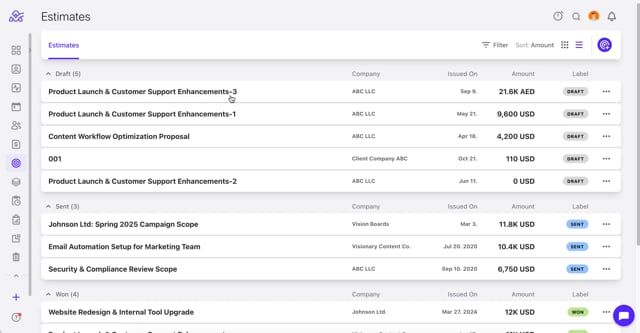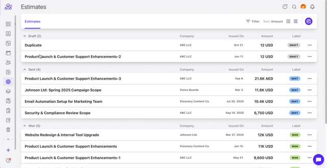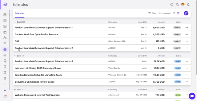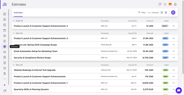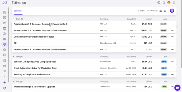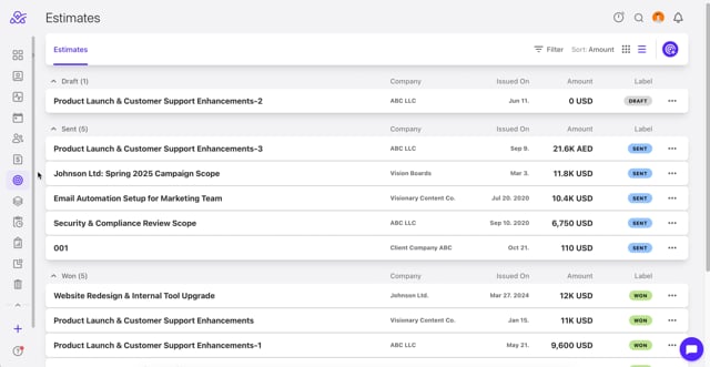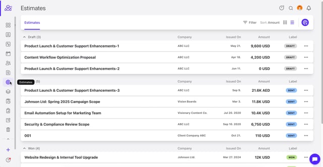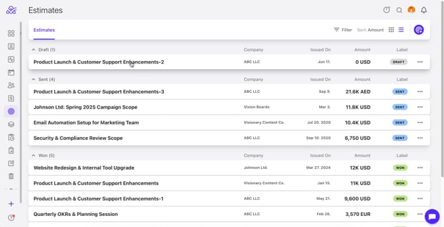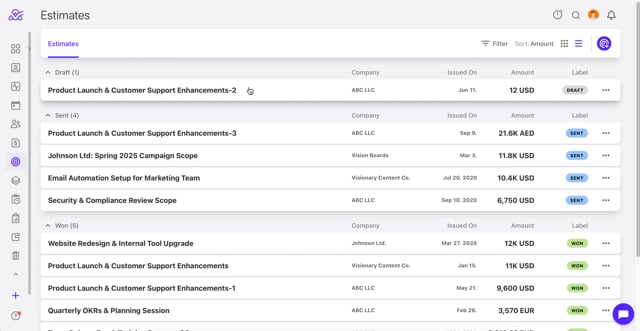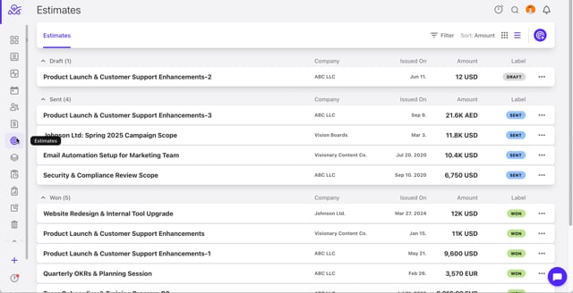 - Status Tracking: Estimates move through statuses like Draft, Sent, Won, Lost, or Cancelled.