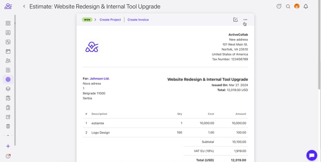 Note: When the client responds and you reach an agreement, you can mark the estimate as Won and start a Project based on this estimate.
