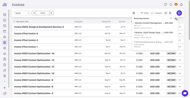After enabling the recurring invoice, the first invoice will be created on the specified date. Subsequent invoices will be created in the selected time intervals.