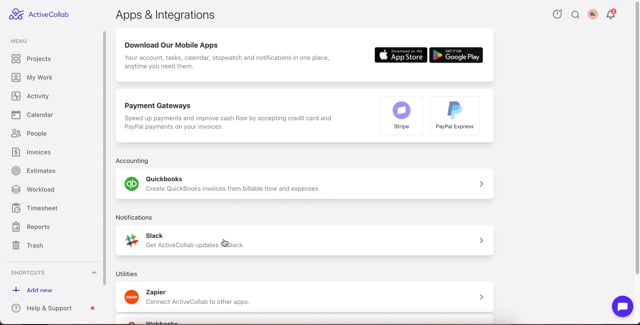 - Stripe - You can easily connect your Stripe and ActiveCollab accounts via the Secret and Publishable APIs.
