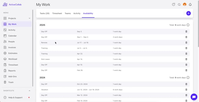 The Availability tab helps you define and share your working schedule. It allows you to declare time off and ensures project managers have full visibility of your capacity.