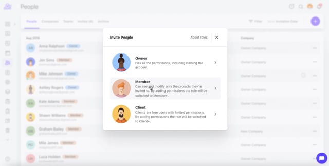 In ActiveCollab, you can downgrade a user with the Member role to a more limited role like Client+ or Client if needed. Here's how to do it: