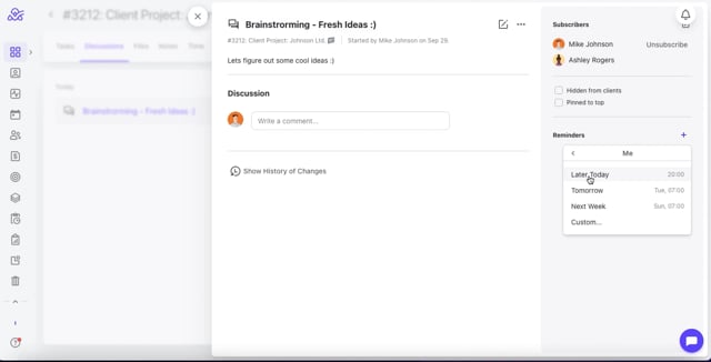 - Hidden from clients - this option allows you to hide certain discussions from the users with the Client and Client + roles