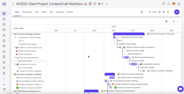A Project Timeline in ActiveCollab is a visual representation (Gantt chart style) of all your project tasks, showing their start and due dates, duration, and dependencies. It helps you plan, schedule, and track the progress of work over time.