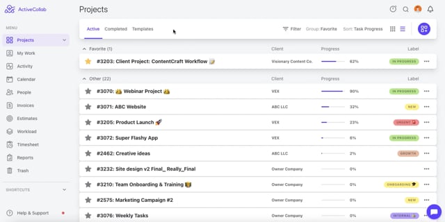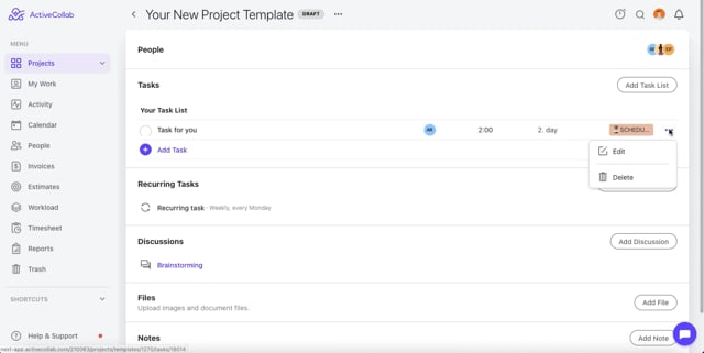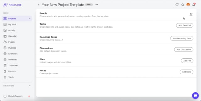 ActiveCollab will create a template based on the structure of that project, including task lists, tasks, assignees, due dates, and labels (if any).
